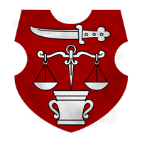 Wappen: Auf rotem Grund in silberner Tinktur ein Mörser und eine Waage. Darüber ein Messer mit nach rechts zeigender Spitze. Rot ist die Farbe Myrtanas. Der Mörser weist auf die in Geldern weit verbreiteten Alchimisten, Tränkebrauer und Kräuterkundigen hin, denn er gehört zu ihrem Arbeitswerkzeug. Die Waage hingegen ist das Symbol der Kaufleute, denn in Geldern werden seit Alters her auch die hier hergestellten Tränke und Tinkturen verkauft. Von dem Messer behaupten böse Zungen, es sei nur im Wappen, um auch ein Werkzeug der Halsabschneider zu zeigen, als die sich viele der Alchimisten und Kaufleute entpuppen, wenn man einen bestimmten Trank dringend benötigt. Aber in Wirklichkeit dürfte es sich um eine Umformung eines einstmals im Wappen zu findenden Schwertes handeln, das einst die Macht des Königs über diese Stadt verkörperte.